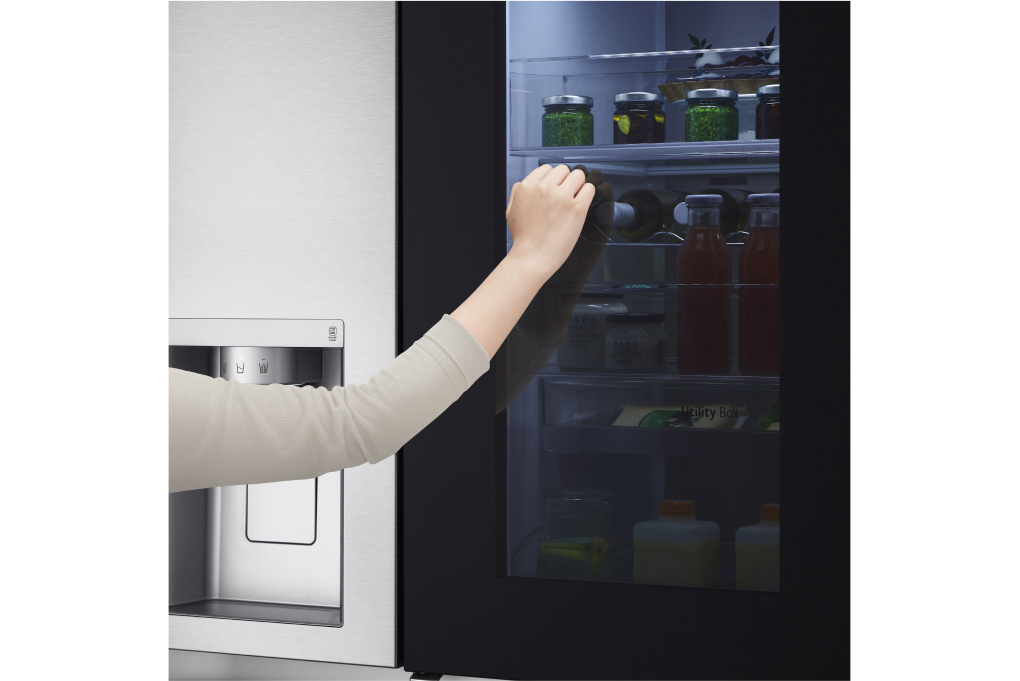– Đặc biệt là thiết kế Door-in-Door khi gõ 2 lần lên cánh tủ là có thể nhìn thấu bên trong, nhờ đó giảm thất thoát khí lạnh và giúp rau quả được bảo quản lâu hơn.
